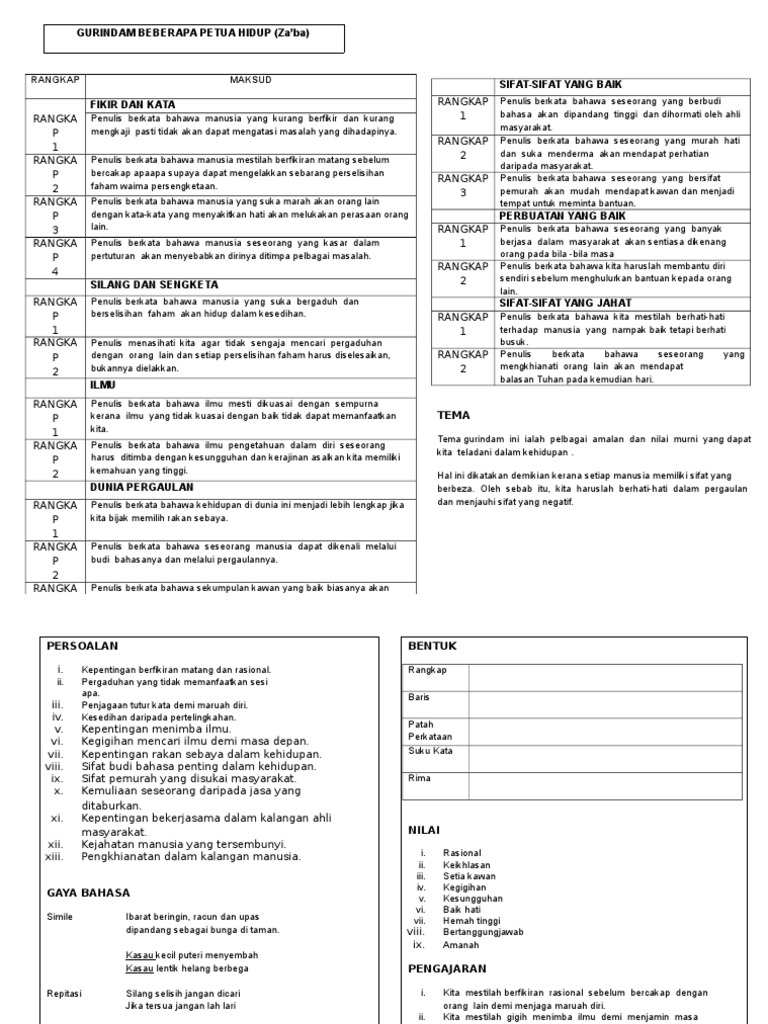 Nota Gurindam Beberapa Petua Hidup Komsas Spm Karangan Net